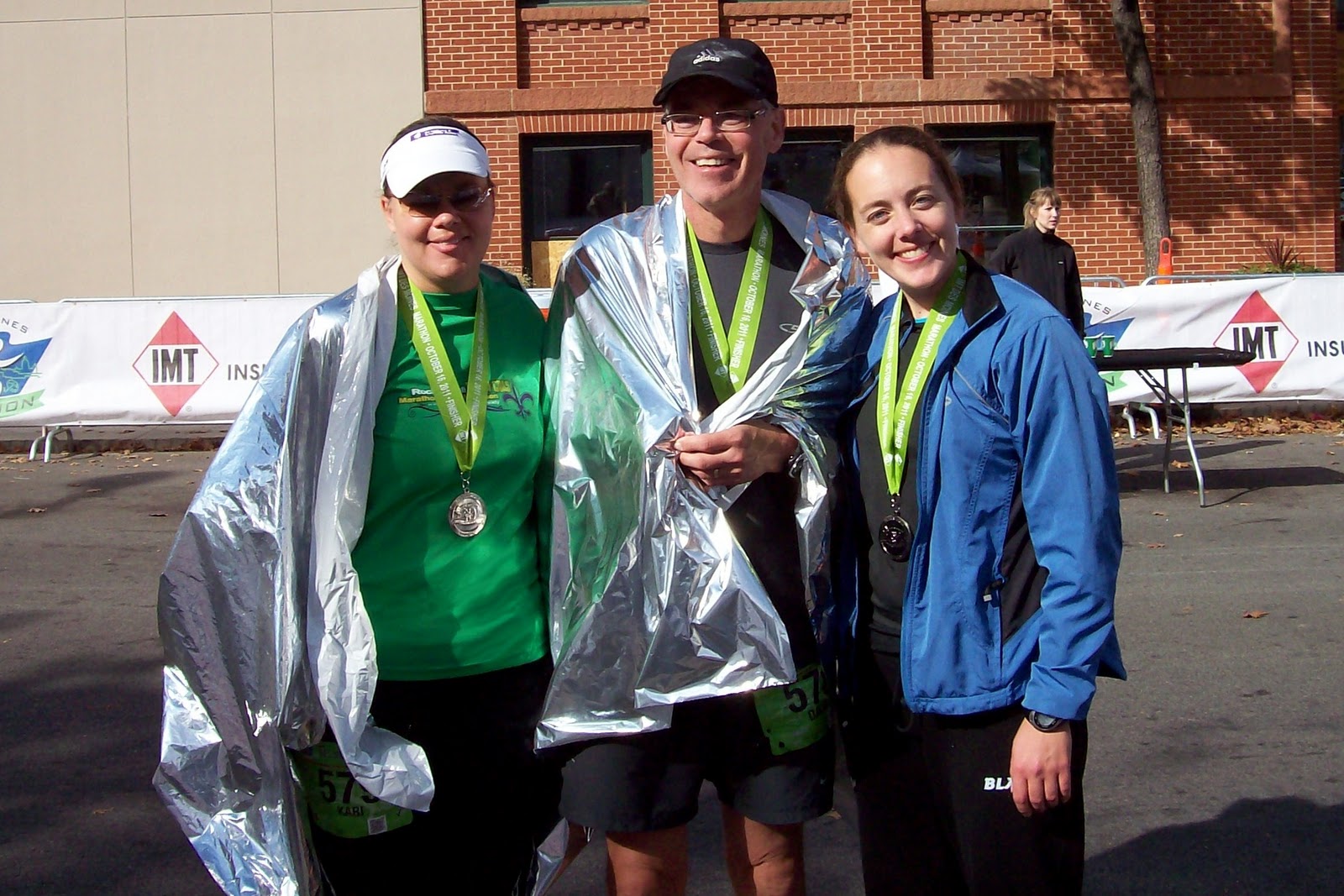 We finished. Kelly finished in 3:55. Dad and I finished in 6:41. Neither of us is particularly overjoyed with our times, but for crash marathon training, they are amazing. Finishing is amazing.